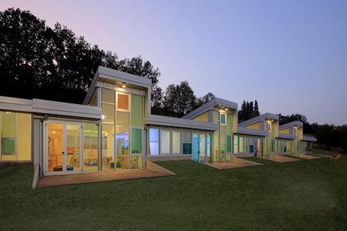 寬大的玻璃窗系統(tǒng)在一天中的不同時(shí)候都可以對(duì)太陽(yáng)光線進(jìn)行過(guò)濾,以保持住室內(nèi)的熱量。其它的熱源通過(guò)兩個(gè)不同的設(shè)備來(lái)獲得:放置在防水壁裝置中的地?zé)崽筋^和位于地面和熱泵間的熱交換設(shè)備。光電池辦被安裝在屋頂隔間中。雨水被收集進(jìn)特別的水槽之中,用于灌溉和沖洗浴室。顏色,材料和特別的設(shè)計(jì)形狀體現(xiàn)出了所有可持續(xù)性的系統(tǒng),它們同時(shí)也體現(xiàn)出了整個(gè)建筑的現(xiàn)代感。