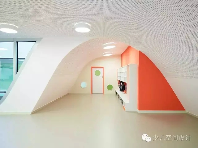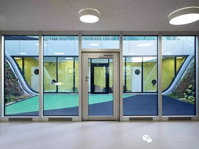 幼兒園的設計手法可稱之為一種夸張的建筑景觀表達。人們能夠從被壓低的核心層來到基地的中心。進入任意一個空間后,均能夠看到室外的活動空地與其他功能房間的活躍狀態。
