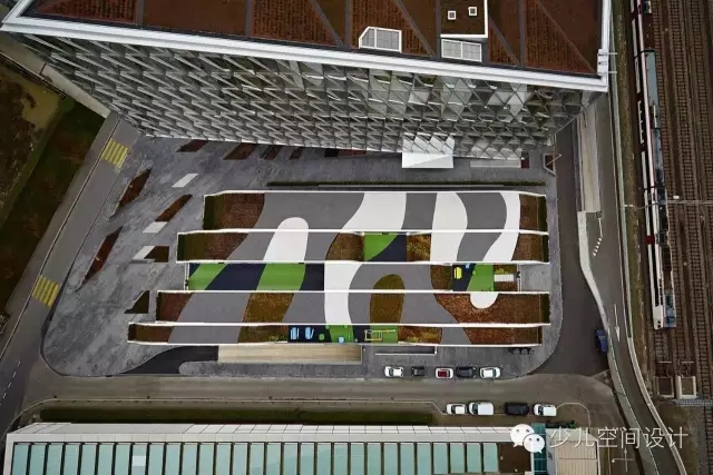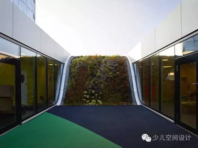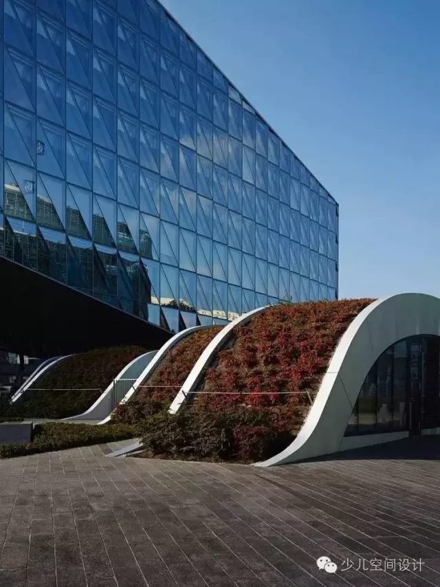 建筑所采用的常規結構及其交替起伏的形態在基地滿鋪,屋面被植株所覆蓋。這種手法在起伏的凸起部分形成遮蔽空間,凹面下則為室內活動區域。Origami 幼兒園的特殊性質源于這種重復的幾何規律形態,設計師運用了多種材料:金屬的窗戶豎框、橫梁與木材等。