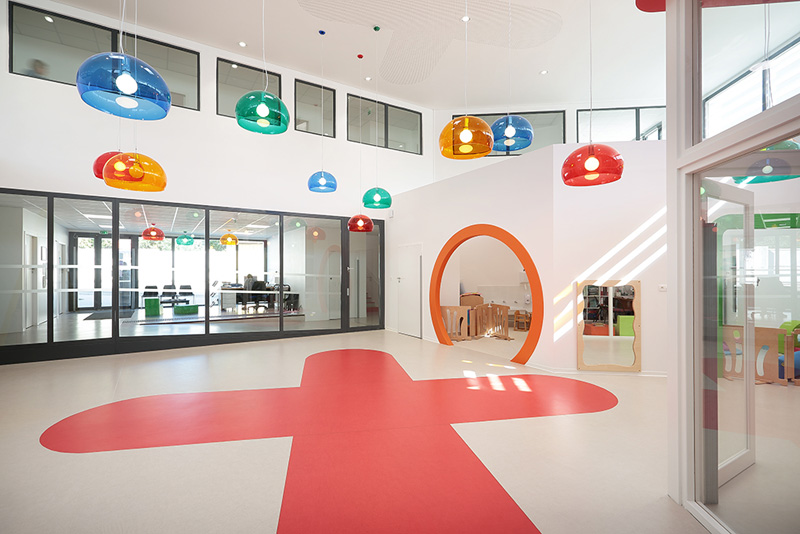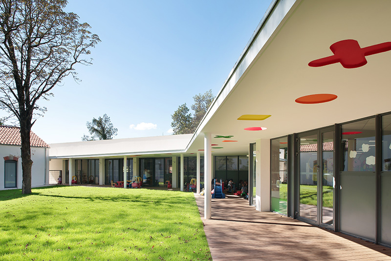 這個育兒中心是以之前的一個農(nóng)業(yè)部門改建而來,位于兩條狹窄的街道的街角之處,值得一提的是育兒中心與l’Ecureuil療養(yǎng)院建在一起:兩個建筑之間有一個漂亮的花園里面有很多栗子樹,增加了它們之間的聯(lián)系和代際關(guān)系。(幼兒園設(shè)計)