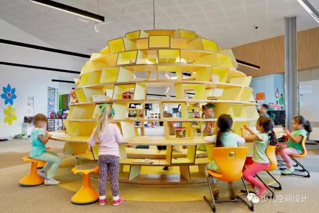 “蜂巢”還提供機(jī)會或交談空間。里面的座位為孩子們提供了“隱蔽的空間”,可以用來進(jìn)行討論、玩游戲,或者只是在這里做功課。在“蜂巢”頂部開口有個圓形熒光燈,照明極佳。不同顏色的地毯也為“蜂巢”劃定“特殊”區(qū)域。