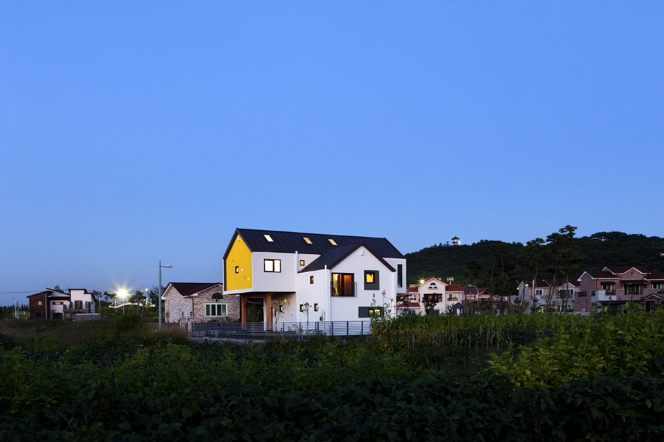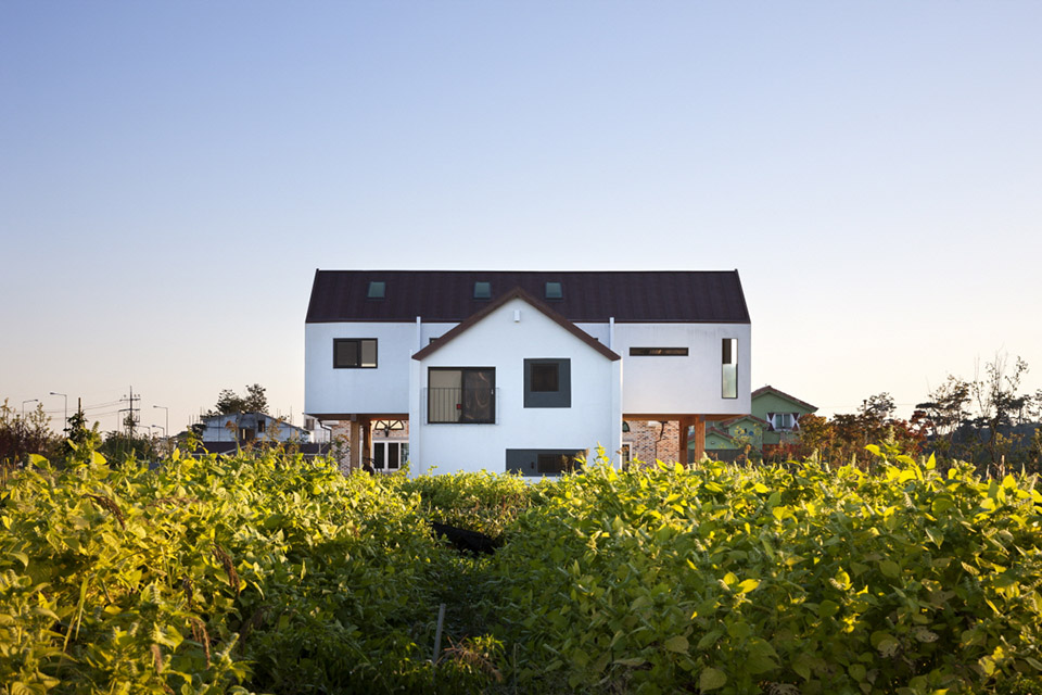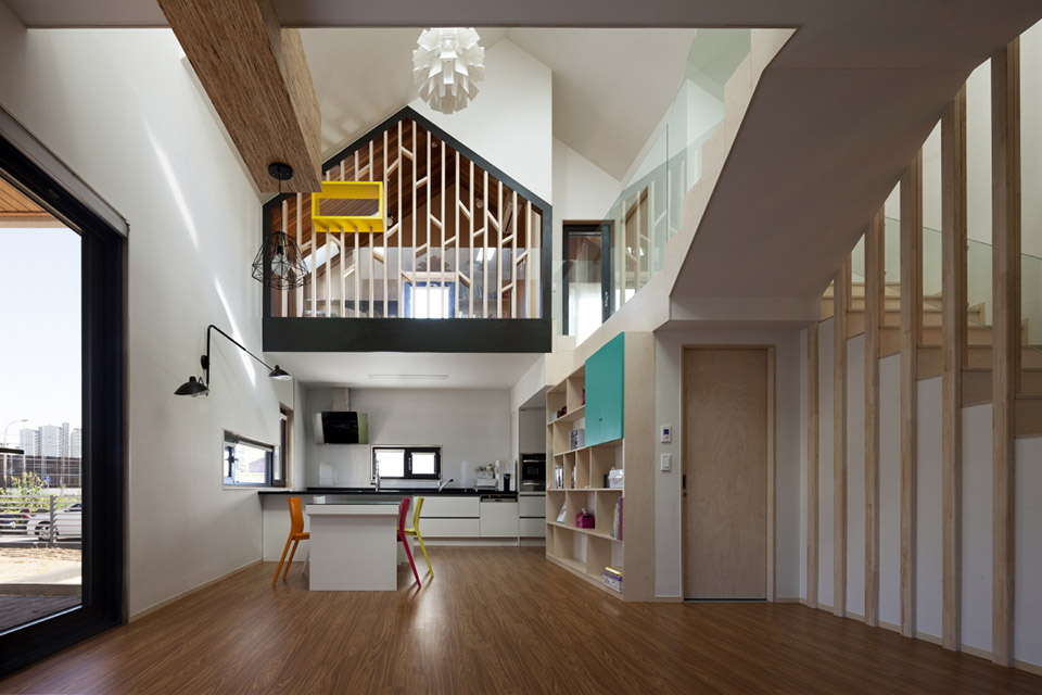在韓國的益山州市有一棟英文字母“T”型的房子,這棟房子是采用30里面后的膠合木建筑的全木質住宅,在T字的兩個端頭被挑起,分別的形成了入口門廊和客廳的花園休閑平臺,一層為開放的大空間,包含了起居室,廚房和餐廳,第二場則是私人空間,設有書房,游戲廳和臥室等房間。