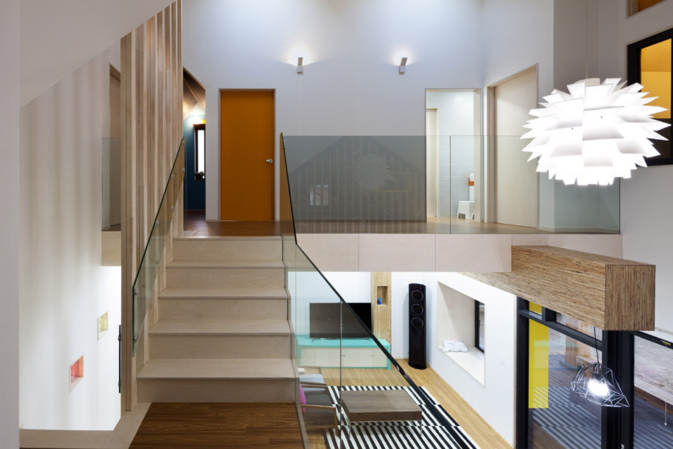 衛生間,臥室和兒童房,還有工作室都設在了二樓。工作室面對院子,這樣可以讓家長在一邊工作室之余也能注意到在外玩耍的孩子。整個房屋以孩子為核心進行設計,創造出有趣關聯還有互動的室內外空間