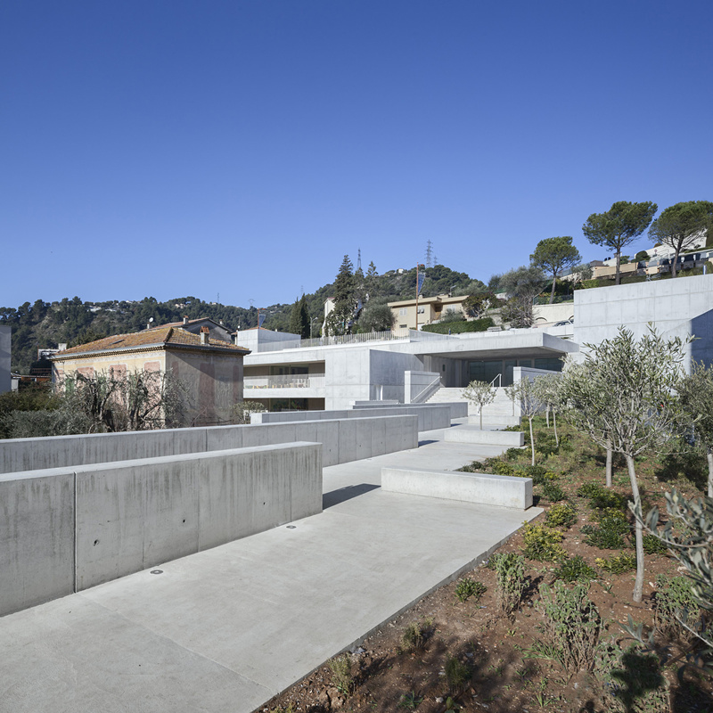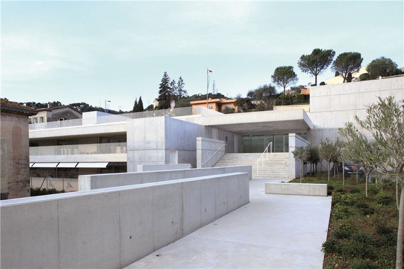 在法國(guó)的一家托兒中心名為L(zhǎng)a Trintite兒童日托中心,這間托兒中心的位置非常有趣,是在公墓和一座購(gòu)物中心中間的一個(gè)花園深處,建筑在場(chǎng)地中的植入,連通周邊環(huán)境,為整個(gè)小鎮(zhèn)創(chuàng)造了一個(gè)新的物理連接——形成一個(gè)連接上部和下部道路的公共通道。受到經(jīng)濟(jì)要素的現(xiàn)實(shí),我們限制了挖掘量,因此將停車場(chǎng)放置在屋頂上,這樣地面空間也可以被塑造成為新的公共空間。兩層樓底板挑出了3米的寬度,以保護(hù)操場(chǎng)不受到太陽(yáng)的直曬。這些水平層面要素的設(shè)計(jì)平衡了結(jié)構(gòu)性的垂直框架,并且容納了日托中心的所有功能要素需求。