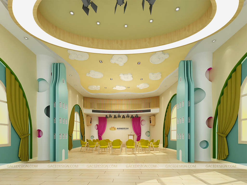 室內環境色彩設計要注意多方便協調因素,在墻體的顏色選擇上要與整體環境和諧統一,不宜選用色度較暗的顏色,地面顏色的選擇與墻體,整體空間要有一致性,保證顏色不突兀,沒有造成不適感與焦躁感,桌椅,門框,教具,黑板,餐桌等設計使用上要與活動室內的環境色彩保持相一致,具有明快,鮮艷的形式感,避免灰色,陰暗大面積出現,造成寶寶不良心理情緒的變化。室內設計在滿足整體設計規劃的前提下,要考慮幼兒體格發育的特征,考慮人體工學的要求,從審美角度與形式感出發努力做到設計整體符合啟發性,趣味性的特征,既新穎獨特富有個性風采,又能保證美觀實用和安全性。