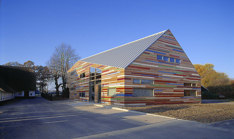 第二層是一個大大陽臺是專門給孩子們活動的,對于一層而言,陽臺還能成為一個遮陽罩。建筑一端尖形的屋頂與農場的環境相協調,而另一端是一個更為現代化的平頂,像是一個谷倉。這樣的組合給整個建筑結構一些不穩定的、親切感。彩色木條紋和玻璃的運用強調了這種感覺,這是一座具有親和力的建筑,看起來像是兒童筆下的杰作,它一點也不雄偉,但卻充滿了夢幻色彩。