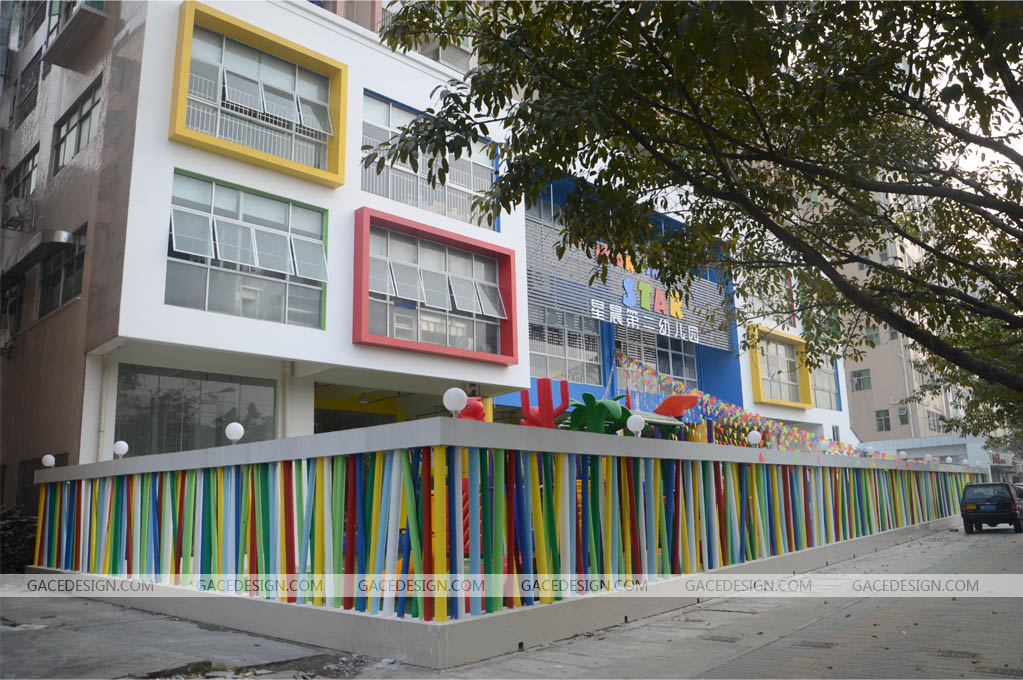 幼兒園院墻形式有通透、封閉和兩者混合的做法,在新建居住區中,應設置安全、美觀、通透的圍墻(或隔離設施),并應安裝安保監視系統。一般采用通透的鐵柵,孩子們玩耍嬉笑聲可以增加居住區的歡樂氣氛,對幼兒園來說也不會感覺在大墻的封閉下。如果幼兒園是沿城市交通道路或在擁擠的居住區中,則可采用封閉的或部分開敞的院墻,從而使內部安靜不受干擾,但實墻應根據當地建設規劃和園內景觀的整體要求,因地制宜地進行裝修,其色彩應與周圍建筑環境相協調,其色彩宜采用暖色調。