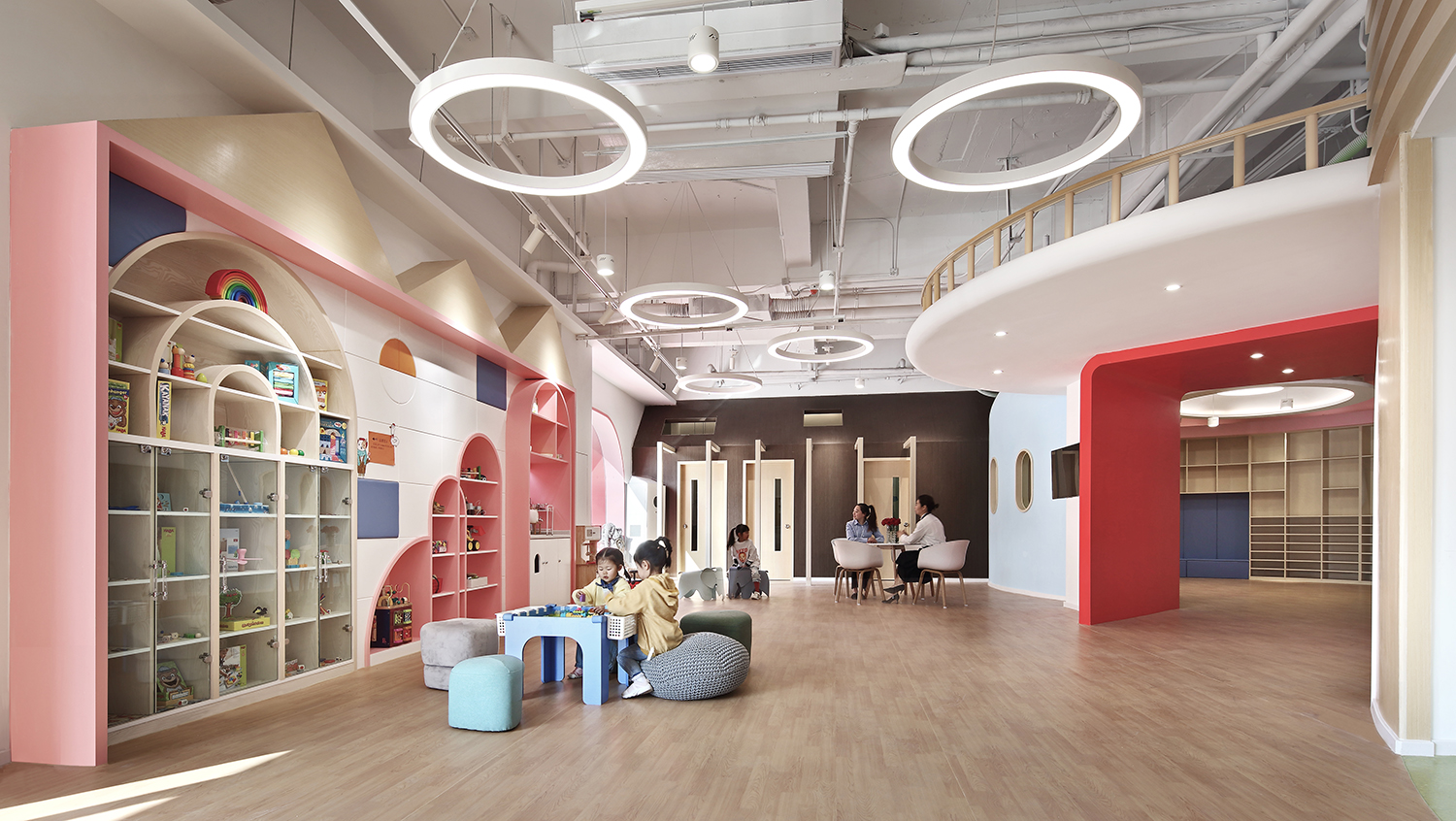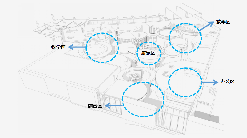 此次設計涉及早教和托育兩大版塊功能需求,包括16間教室、1個游樂區,以及書吧、辦公區、廚餐區等。設計師將原有場地進行清理和重新分割,根據項目需求和場地情況將中部規劃為早教區,托育教室則圍繞早教區環形安置,主門在南面,接送門在西側。