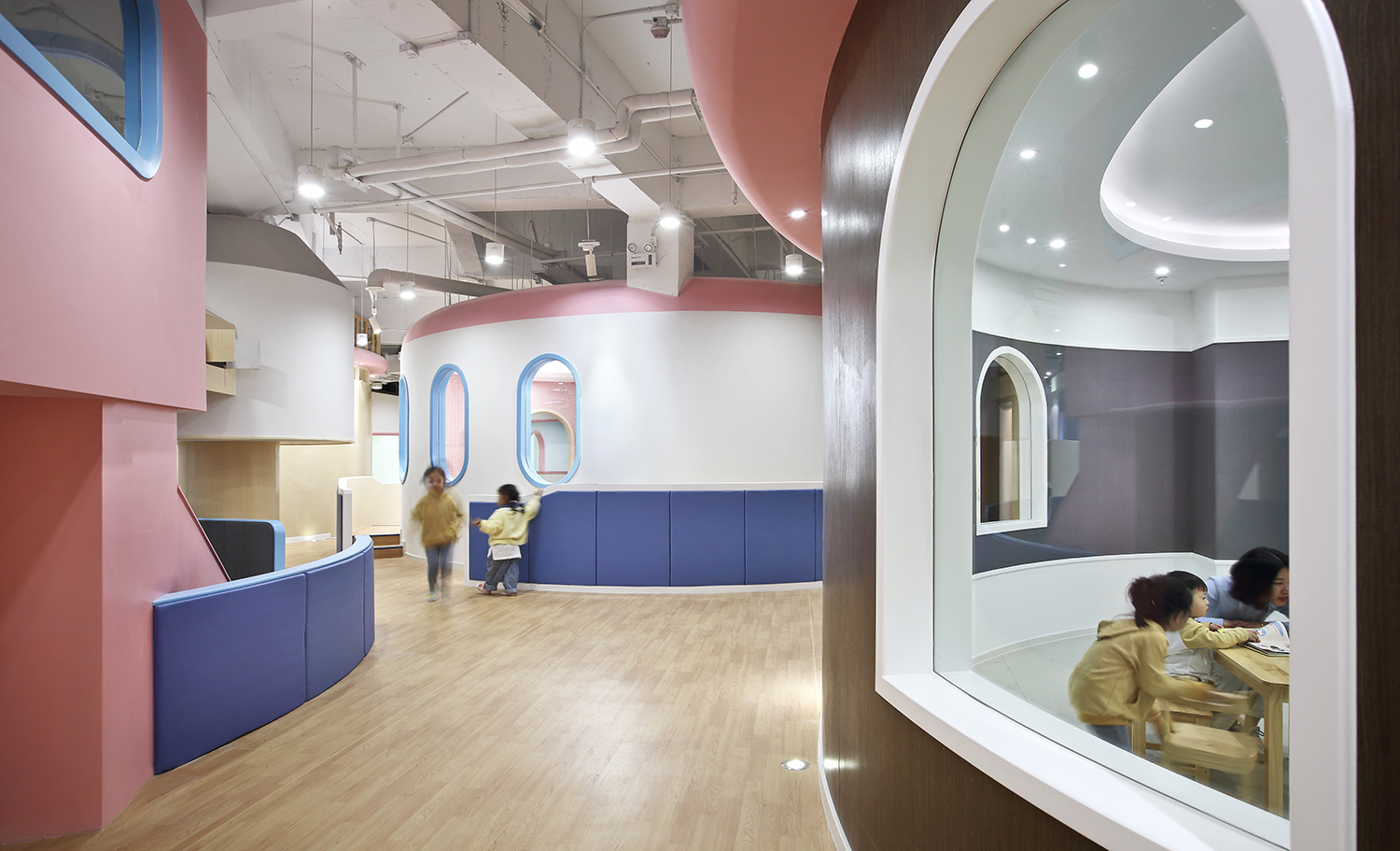 游戲是孩子的活力之源,也是孩子通往世界的途徑。設計師將游樂區布局在室內的中心位置,讓孩子的歡聲笑語激活整座“城”。孩子們會帶著好奇和期待爬上梯子,穿過可愛的小木屋,在管道中匍匐前進,然后“咻”地一下滑入下沉的球池,在不斷變化動作和愉悅的體驗中獲得身心的鍛煉和能力的發展。